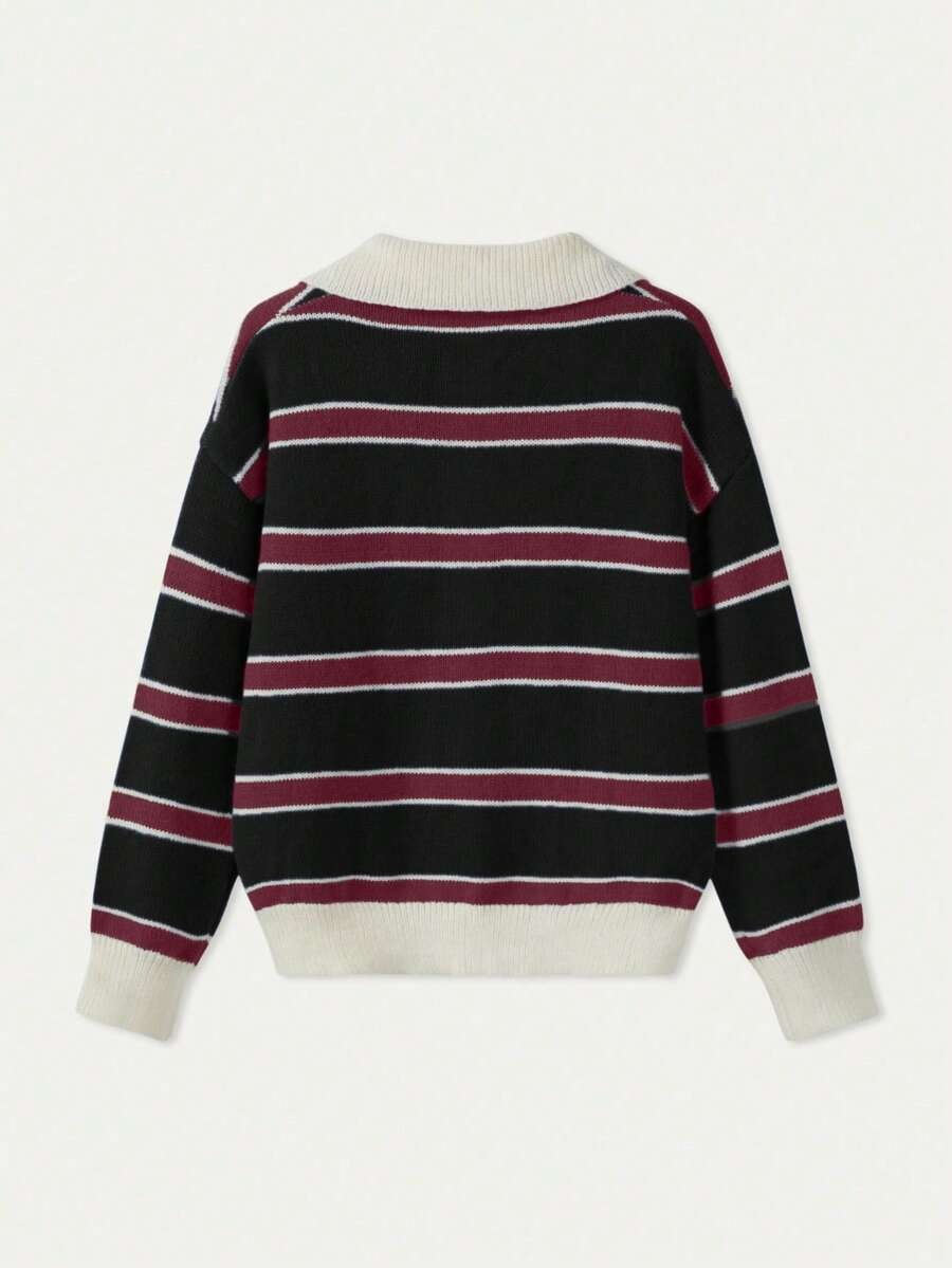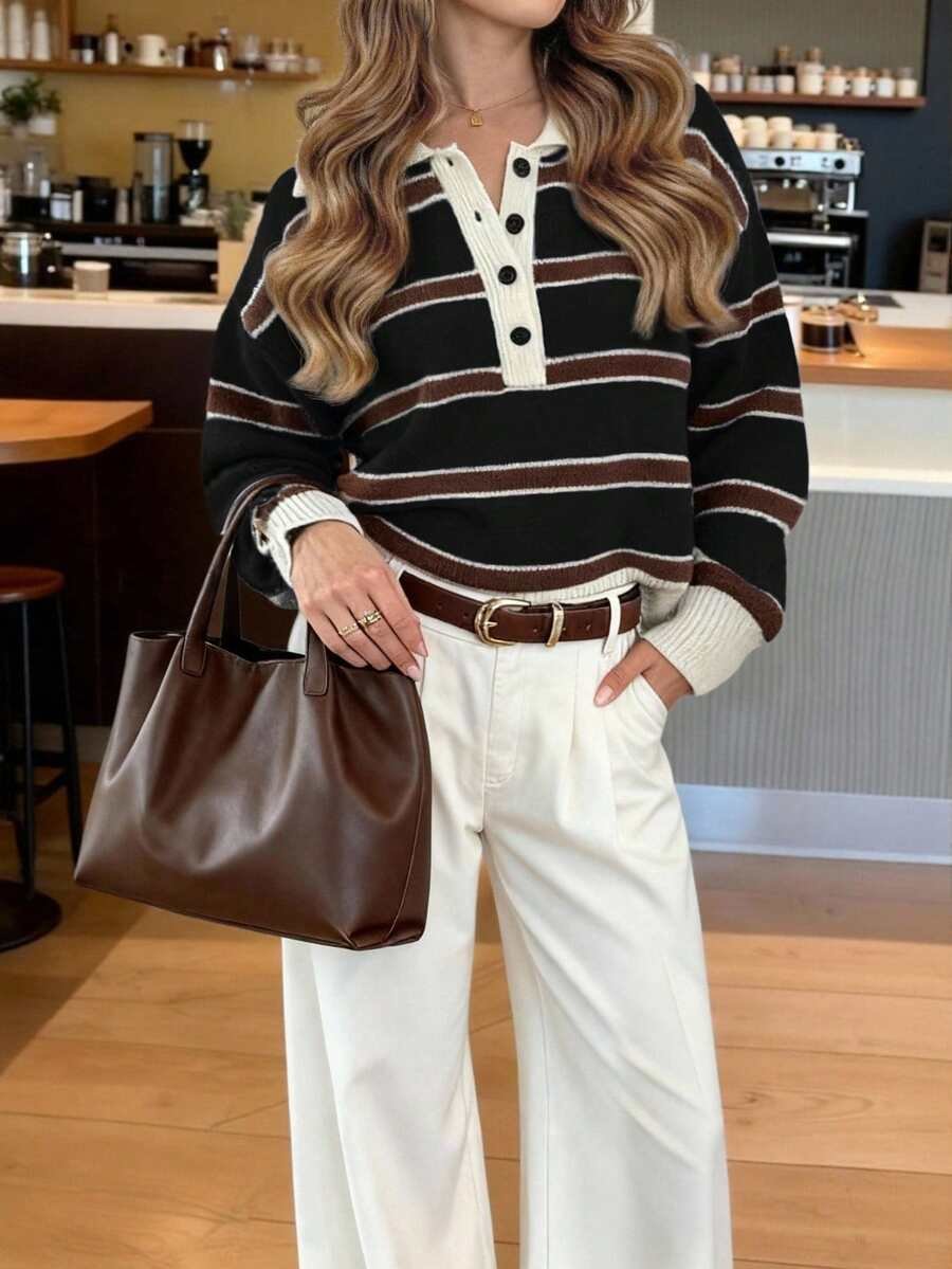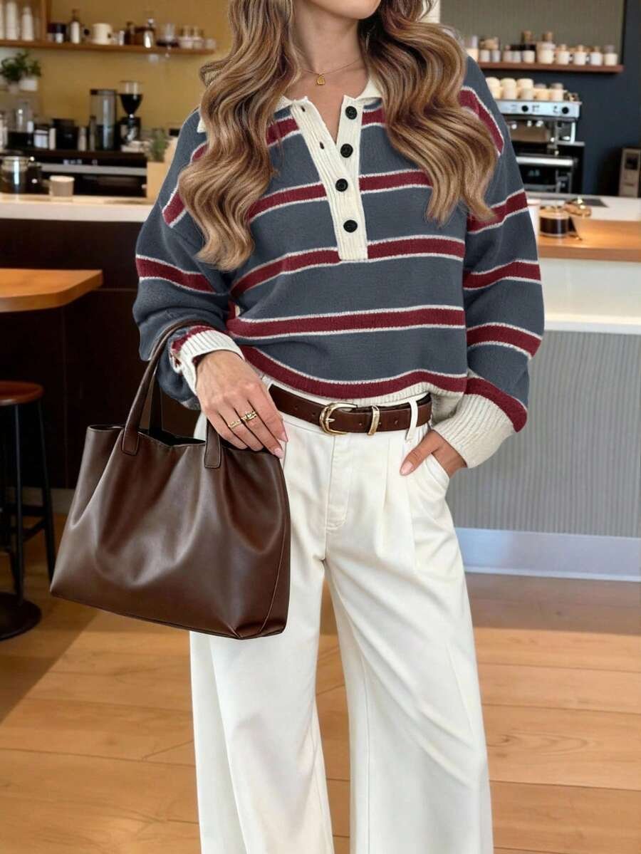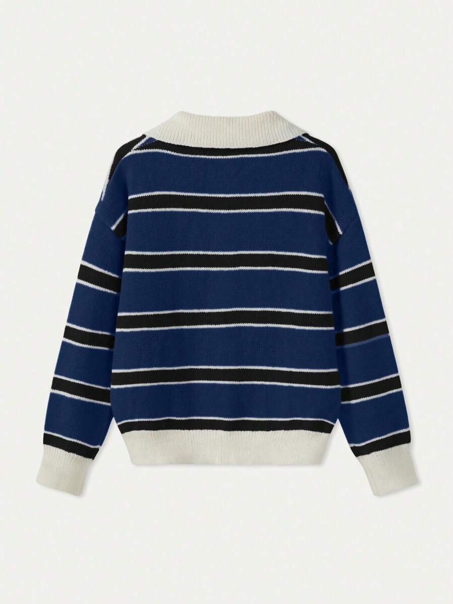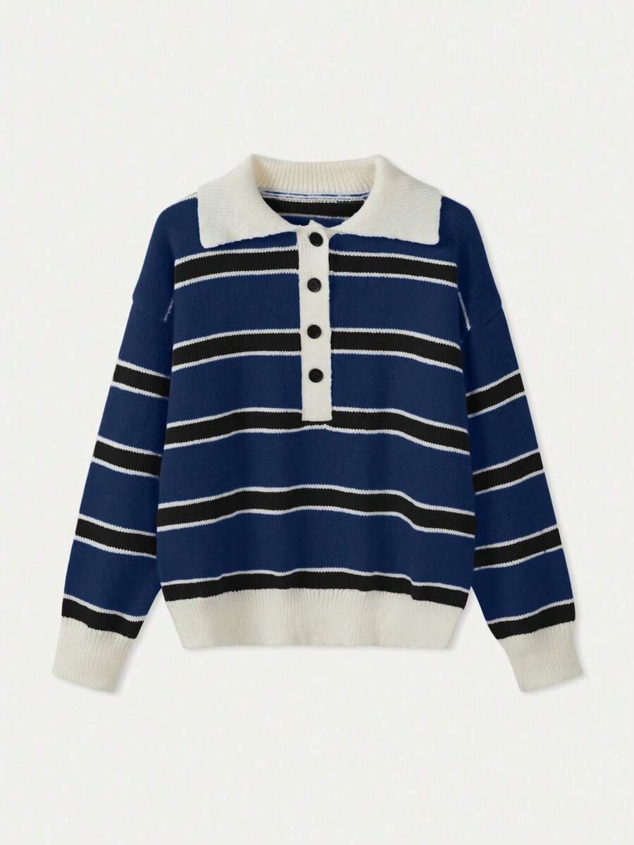 - اسم المنتج: كنزة صوف بولو مخططة بتباين الألوان للنساء