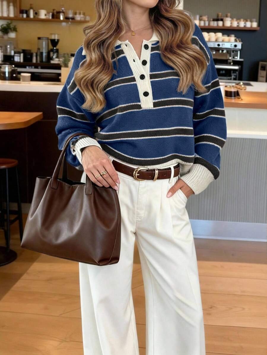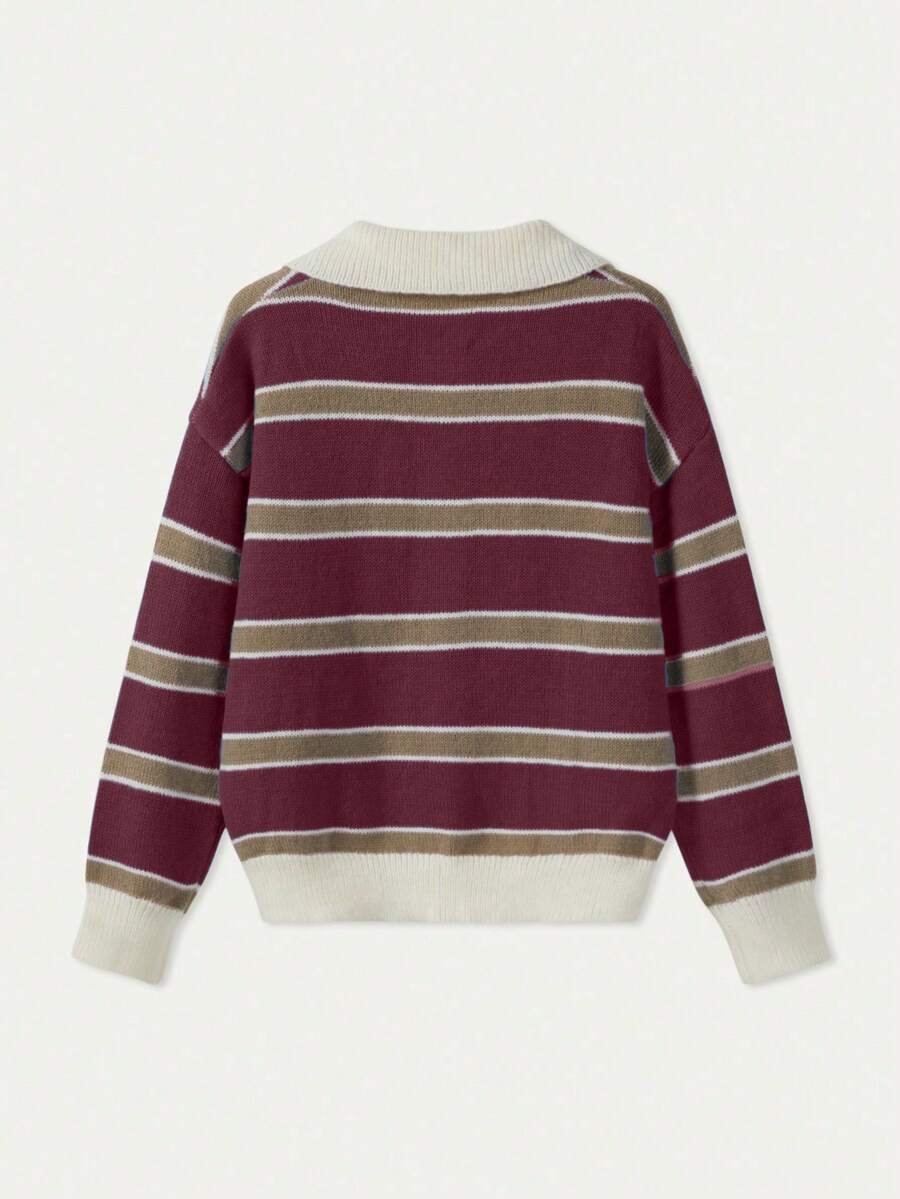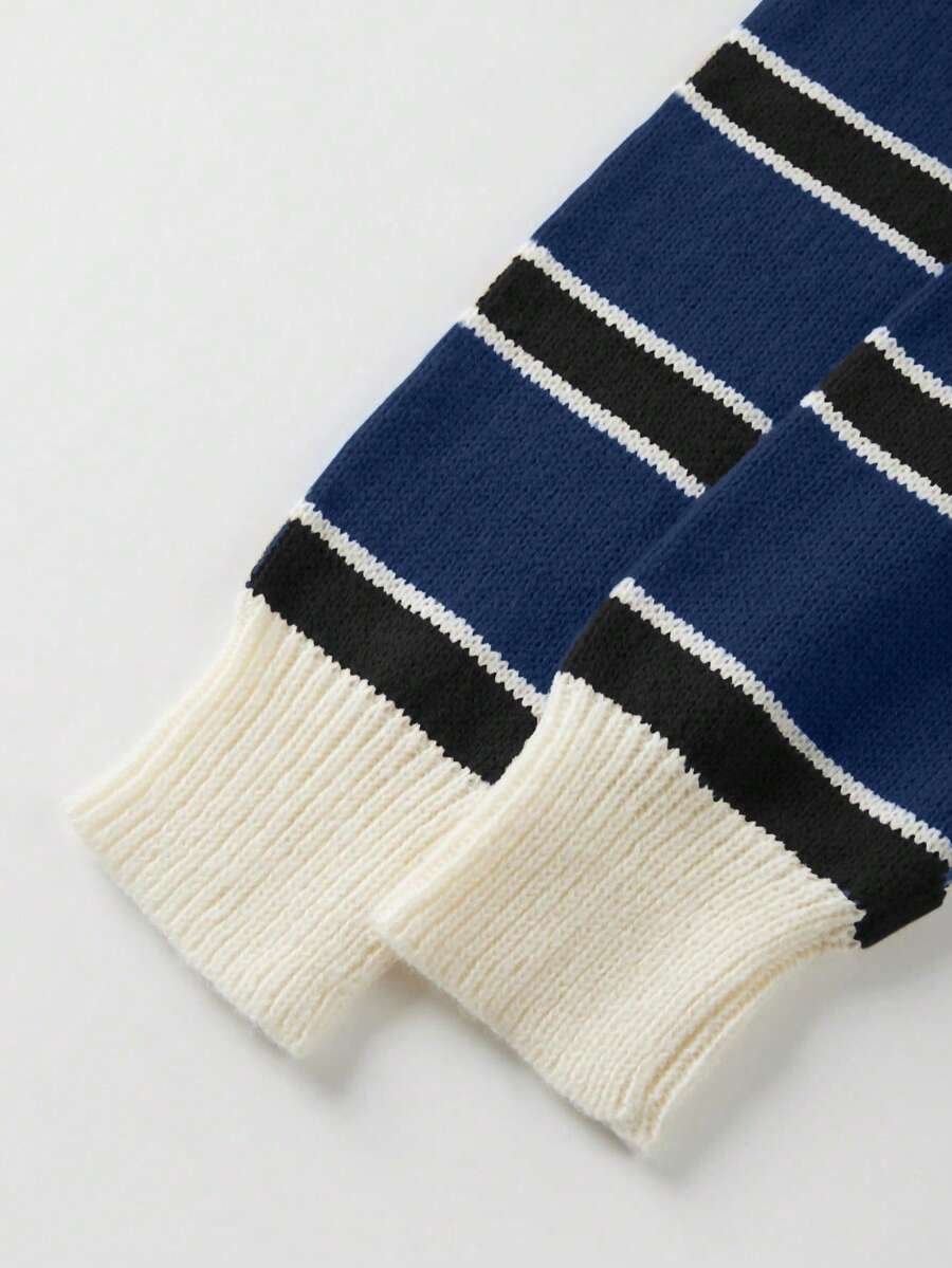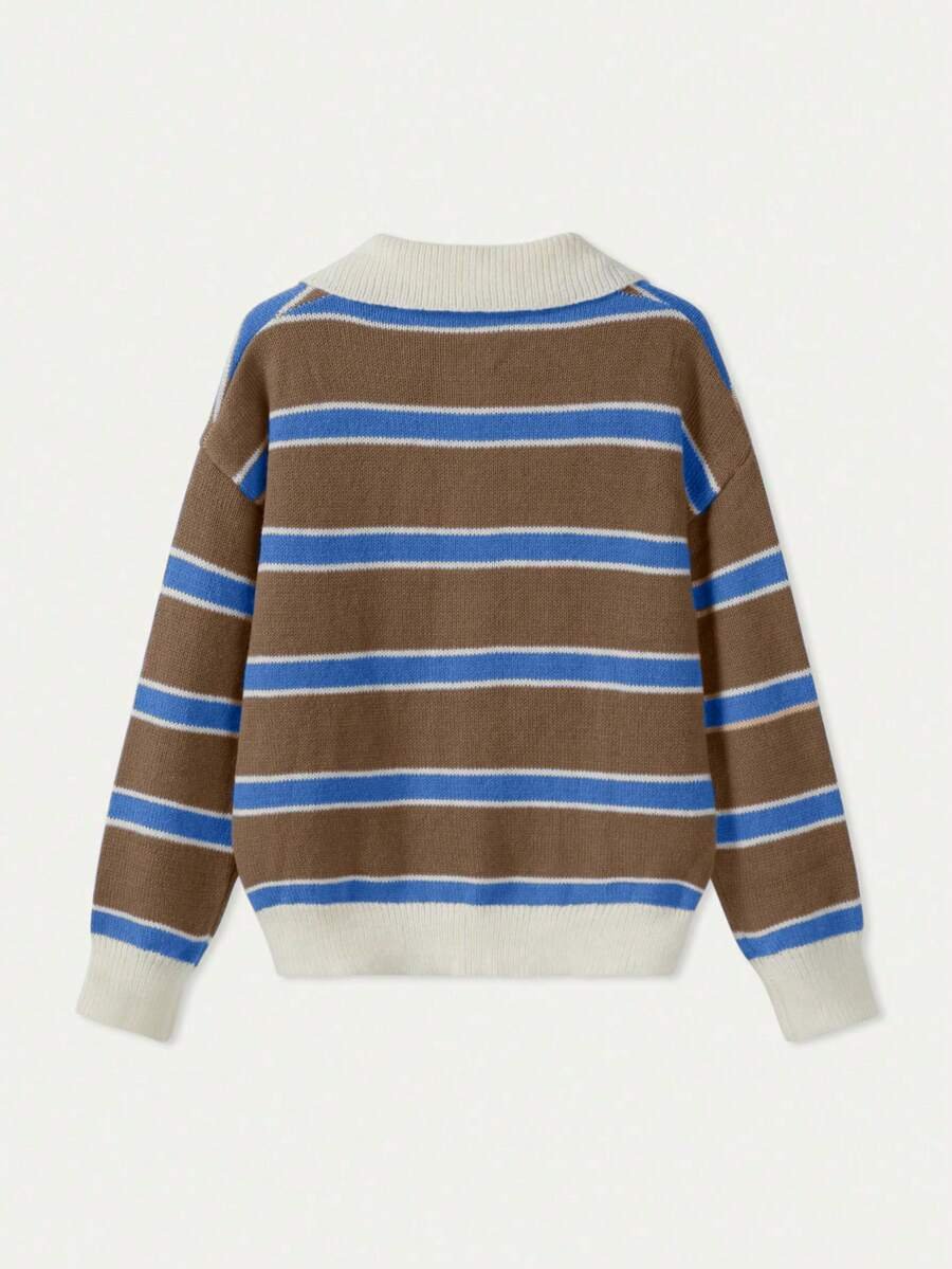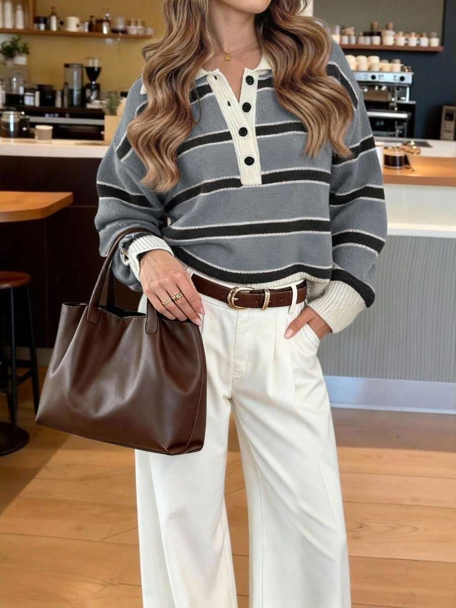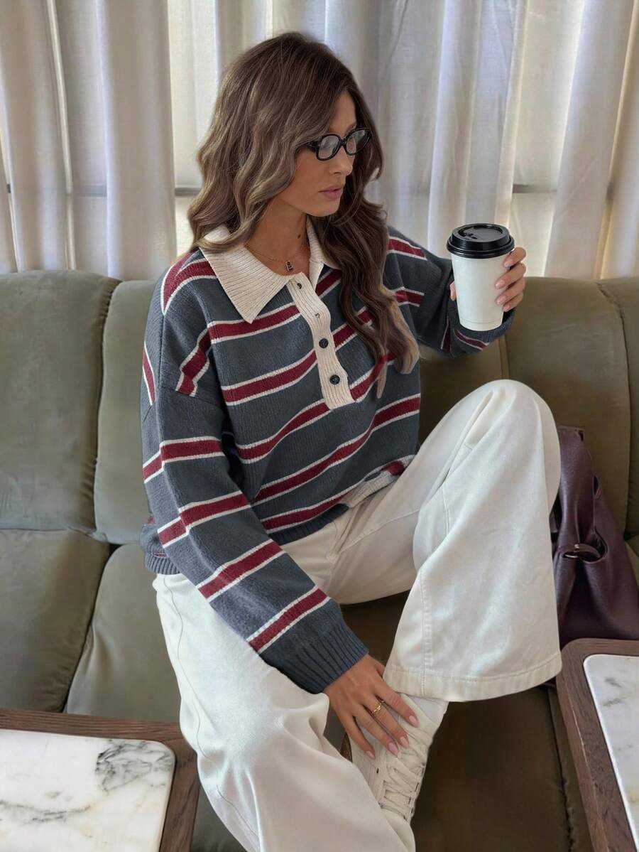 - اسم المنتج: كنزة صوف بولو مخططة بتباين الألوان للنساء